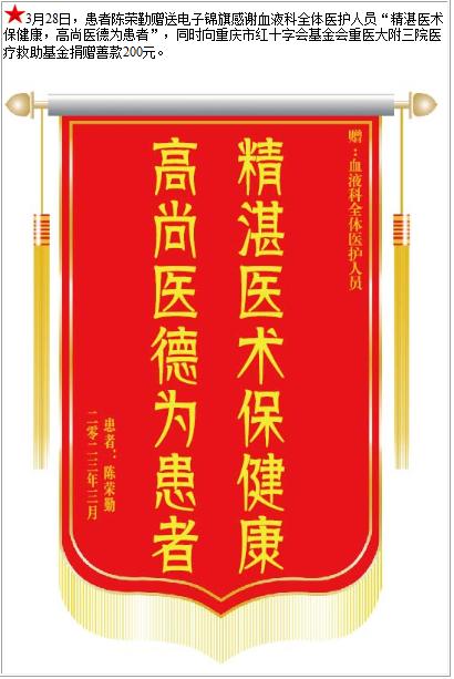 患者陈荣勤赠送电子锦旗感谢血液科全体医护人员,并向医疗救助基金捐赠善款200元-锦旗-患者心声-患者服务-重庆医科大学附属第三医院【官方网站】
