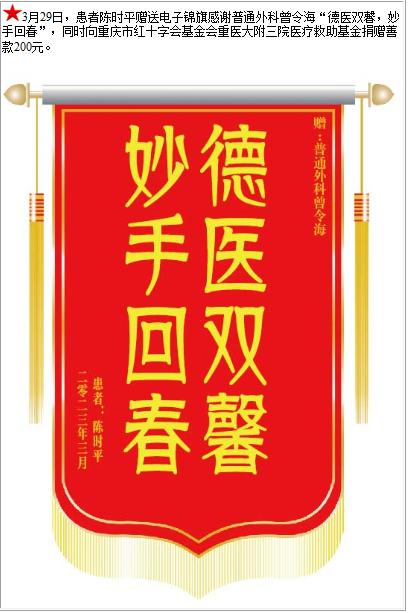 患者陈时平赠送电子锦旗感谢普通外科曾令海,并向医疗救助基金捐赠善款200元。-锦旗-患者心声-患者服务-重庆医科大学附属第三医院【官方网站】