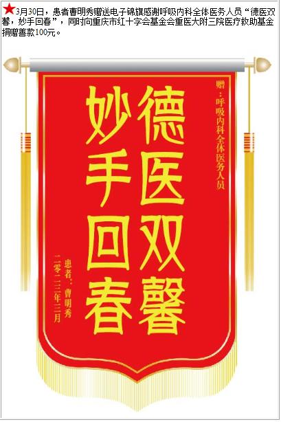 患者曹明秀赠送电子锦旗感谢呼吸内科全体医务人员,并向医疗救助基金捐赠善款100元-锦旗-患者心声-患者服务-重庆医科大学附属第三医院【官方网站】
