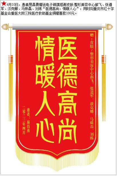 患者易昌勇赠送电子锦旗感谢皮肤/整形美容中心郝飞等人,并向医疗救助基金捐赠善款100元-锦旗-患者心声-患者服务-重庆医科大学附属第三医院【官方网站】