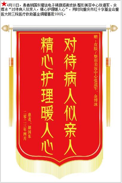 患者胡国东赠送电子锦旗感谢皮肤/整形美容中心张道军等人,并向医疗救助基金捐赠善款100元-锦旗-患者心声-患者服务-重庆医科大学附属第三医院【官方网站】