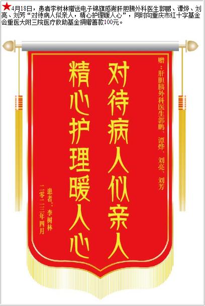 患者李树林赠送电子锦旗感谢肝胆胰外科医生郭鹏等人,并向医疗救助基金捐赠善款100元-锦旗-患者心声-患者服务-重庆医科大学附属第三医院【官方网站】