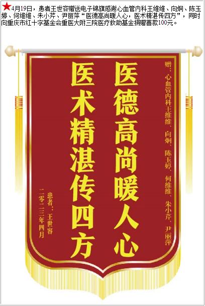 患者王世容赠送电子锦旗感谢心血管内科王维维等人,并向医疗救助基金捐赠善款100元-锦旗-患者心声-患者服务-重庆医科大学附属第三医院【官方网站】