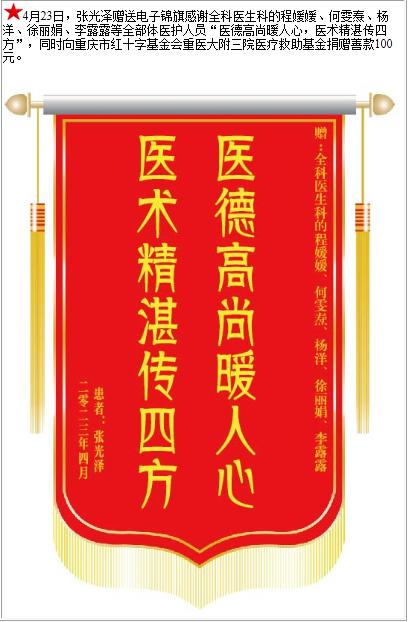 患者张光泽赠送电子锦旗感谢全科医生科的程媛媛等人及全部体医护人员,并向医疗救助基金捐赠善款100元-锦旗-患者心声-患者服务-重庆医科大学附属第三医院【官方网站】
