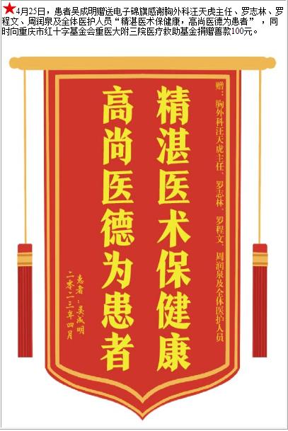 患者吴成明赠送电子锦旗感谢胸外科汪天虎主任等人及全体医护人员,并向医疗救助基金捐赠善款100元-锦旗-患者心声-患者服务-重庆医科大学附属第三医院【官方网站】