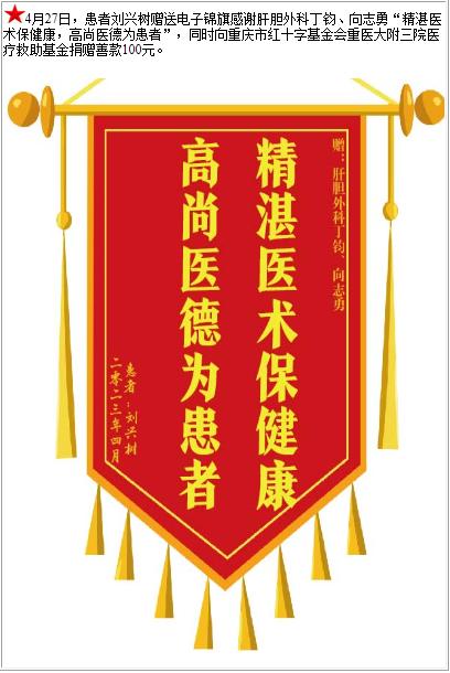 患者刘兴树赠送电子锦旗感谢肝胆外科丁钧等人,并向医疗救助基金捐赠善款100元-锦旗-患者心声-患者服务-重庆医科大学附属第三医院【官方网站】
