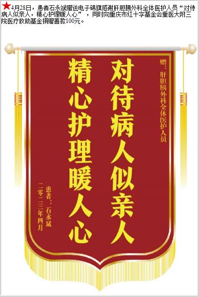 患者石永斌赠送电子锦旗感谢肝胆胰外科全体医护人员,并向医疗救助基金捐赠善款100元-锦旗-患者心声-患者服务-重庆医科大学附属第三医院【官方网站】