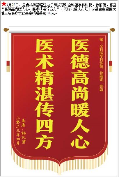 患者杨凤碧赠送电子锦旗感谢全科医学科张悦等人,并向医疗救助基金捐赠善款100元-锦旗-患者心声-患者服务-重庆医科大学附属第三医院【官方网站】
