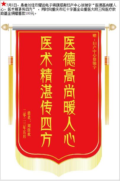 患者刘佳欢赠送电子锦旗感谢妇产中心徐驰宇,并向医疗救助基金捐赠善款100元-锦旗-患者心声-患者服务-重庆医科大学附属第三医院【官方网站】