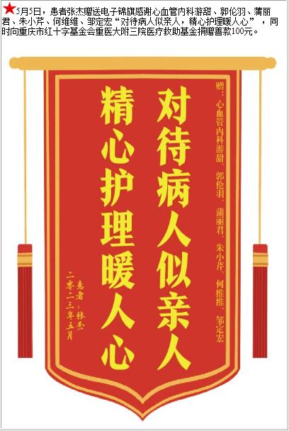 患者张杰赠送电子锦旗感谢心血管内科游甜等人,并向医疗救助基金捐赠善款100元-锦旗-患者心声-患者服务-重庆医科大学附属第三医院【官方网站】