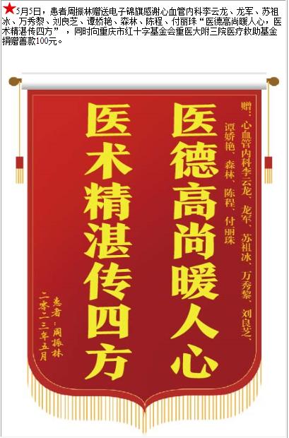 患者周振林赠送电子锦旗感谢心血管内科李云龙等人,并向医疗救助基金捐赠善款100元-锦旗-患者心声-患者服务-重庆医科大学附属第三医院【官方网站】