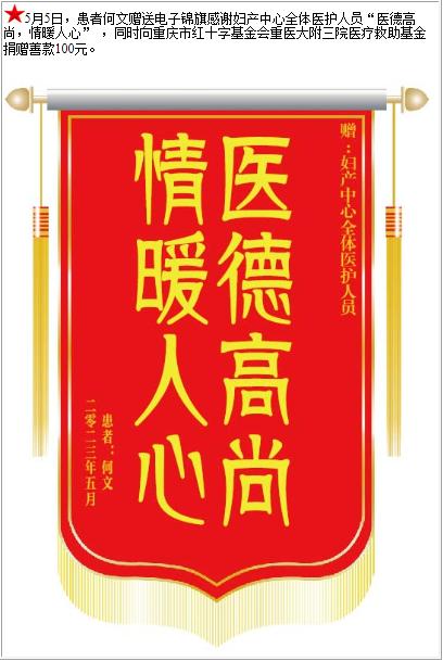 患者何文赠送电子锦旗感谢妇产中心全体医护人员,并向医疗救助基金捐赠善款100元-锦旗-患者心声-患者服务-重庆医科大学附属第三医院【官方网站】