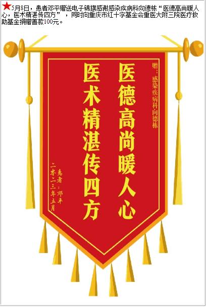 患者邓平赠送电子锦旗感谢感染疾病科向德栋,并向医疗救助基金捐赠善款100元-锦旗-患者心声-患者服务-重庆医科大学附属第三医院【官方网站】