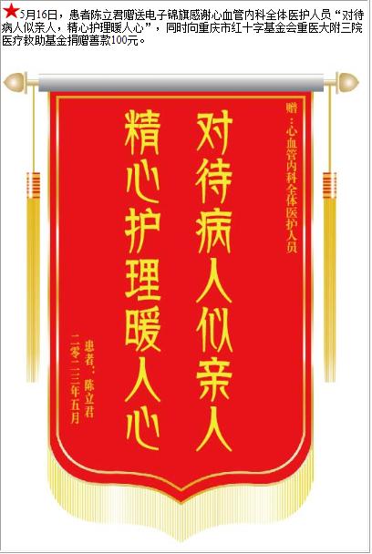 患者陈立君赠送电子锦旗感谢心血管内科全体医护人员,并向医疗救助基金捐赠善款100元-锦旗-患者心声-患者服务-重庆医科大学附属第三医院【官方网站】