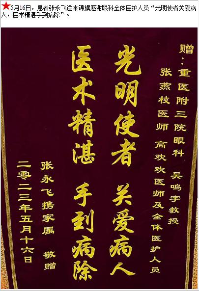 患者张永飞送来锦旗感谢眼科全体医护人员“光明使者关爱病人,医术精湛手到病除”-锦旗-患者心声-患者服务-重庆医科大学附属第三医院【官方网站】