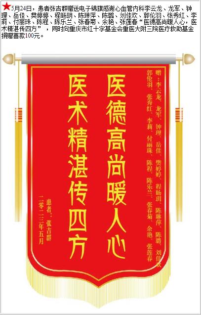 患者张吉群赠送电子锦旗感谢心血管内科李云龙等人,并向医疗救助基金捐赠善款100元-锦旗-患者心声-患者服务-重庆医科大学附属第三医院【官方网站】