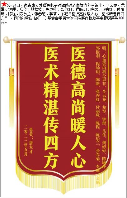 患者唐大才赠送电子锦旗感谢心血管内科仝识非等人,并向医疗救助基金捐赠善款100元-锦旗-患者心声-患者服务-重庆医科大学附属第三医院【官方网站】