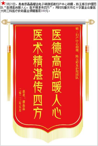 患者廖晶晶赠送电子锦旗感谢妇产中心胡珊等人及护理团队,并向医疗救助基金捐赠善款100元-锦旗-患者心声-患者服务-重庆医科大学附属第三医院【官方网站】