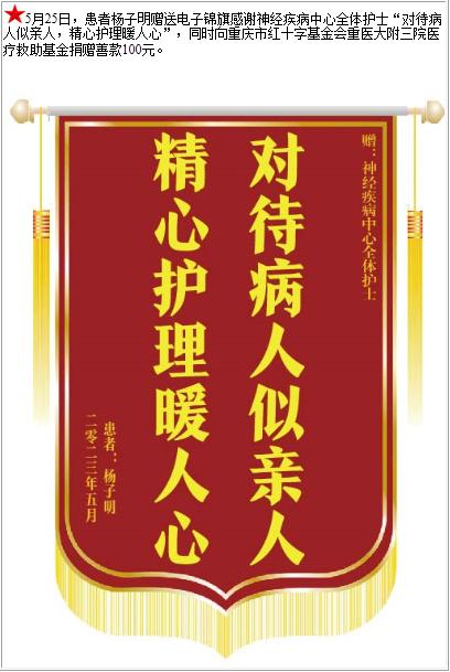患者杨子明赠送电子锦旗感谢神经疾病中心全体护士,并向医疗救助基金捐赠善款100元-锦旗-患者心声-患者服务-重庆医科大学附属第三医院【官方网站】