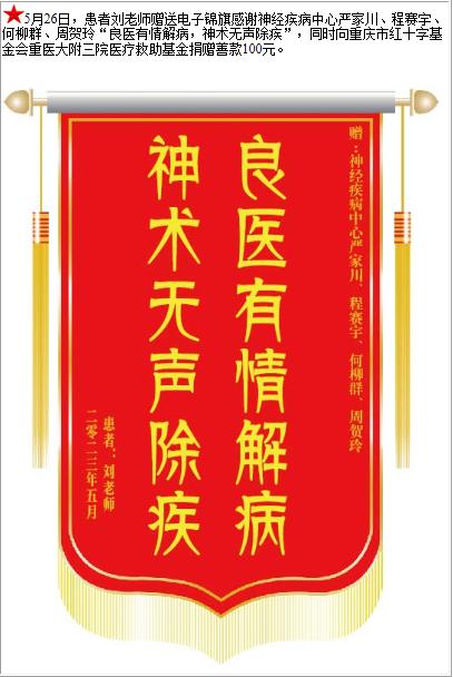 患者刘老师赠送电子锦旗感谢神经疾病中心严家川等人,并向医疗救助基金捐赠善款100元-锦旗-患者心声-患者服务-重庆医科大学附属第三医院【官方网站】