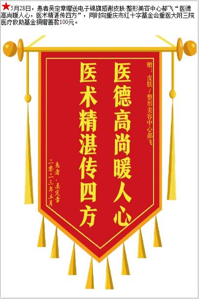 患者吴定章赠送电子锦旗感谢皮肤/整形美容中心郝飞,并向医疗救助基金捐赠善款100元-锦旗-患者心声-患者服务-重庆医科大学附属第三医院【官方网站】