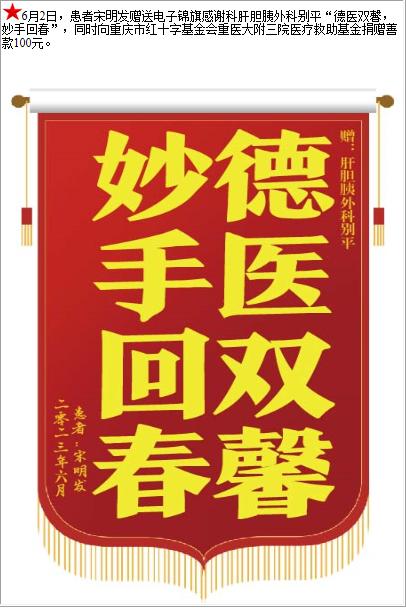 患者宋明发赠送电子锦旗感谢科肝胆胰外科别平,并向医疗救助基金捐赠善款100元-锦旗-患者心声-患者服务-重庆医科大学附属第三医院【官方网站】