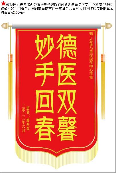 患者廖西荣赠送电子锦旗感谢急诊与重症医学中心李霞,并向医疗救助基金捐赠善款100元-锦旗-患者心声-患者服务-重庆医科大学附属第三医院【官方网站】