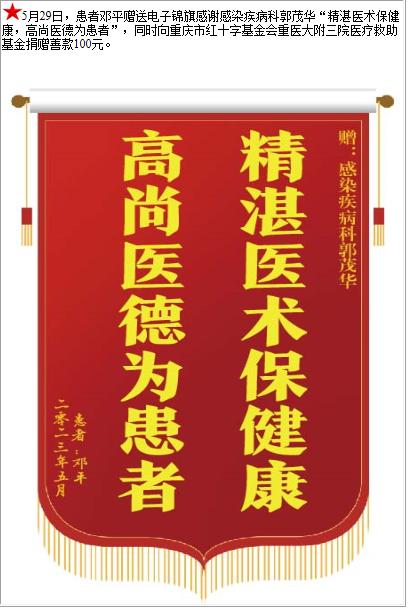 患者邓平赠送电子锦旗感谢感染疾病科郭茂华,并向医疗救助基金捐赠善款100元-锦旗-患者心声-患者服务-重庆医科大学附属第三医院【官方网站】