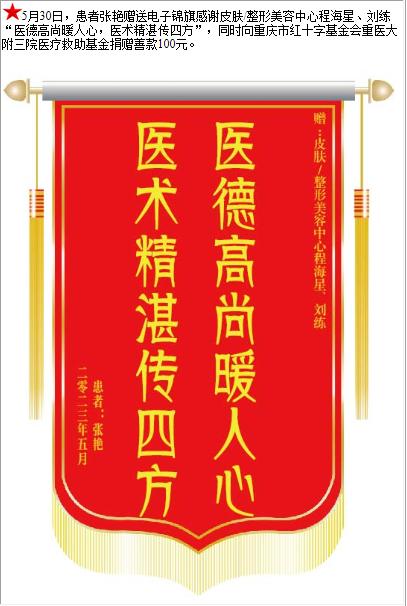 患者张艳赠送电子锦旗感谢皮肤/整形美容中心程海星等人,并向医疗救助基金捐赠善款100元-锦旗-患者心声-患者服务-重庆医科大学附属第三医院【官方网站】