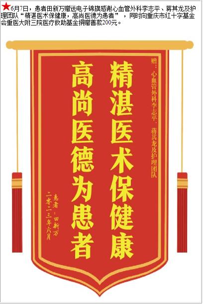 患者田新万赠送电子锦旗感谢心血管外科李志平等人及护理团队,并向医疗救助基金捐赠善款200元-锦旗-患者心声-患者服务-重庆医科大学附属第三医院【官方网站】