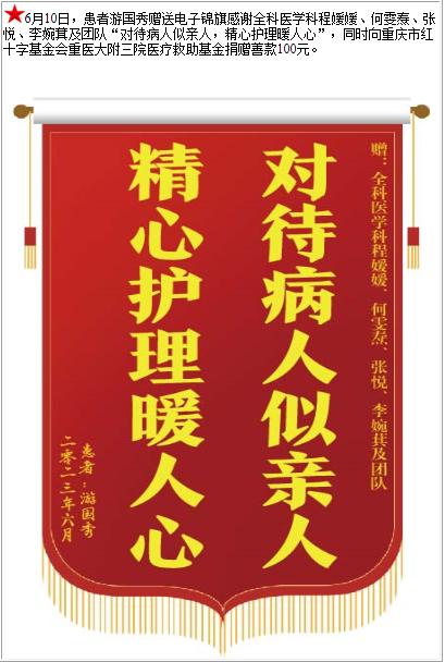 患者游国秀赠送电子锦旗感谢全科医学科程媛媛等人萁及团队,并向医疗救助基金捐赠善款100元-锦旗-患者心声-患者服务-重庆医科大学附属第三医院【官方网站】