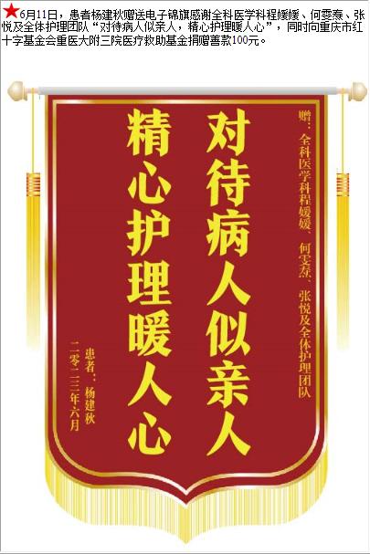 患者杨建秋赠送电子锦旗感谢全科医学科程媛媛等人及全体护理团队,并向医疗救助基金捐赠善款100元-锦旗-患者心声-患者服务-重庆医科大学附属第三医院【官方网站】