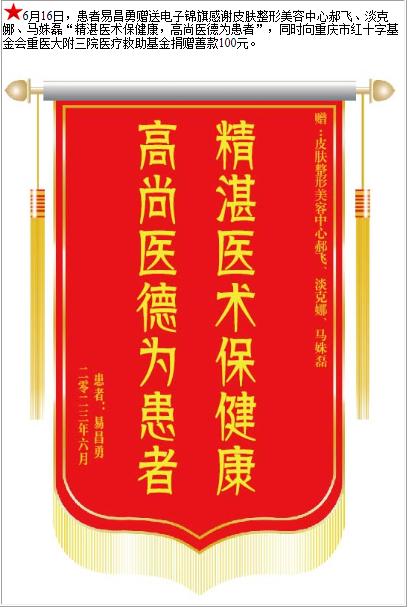 患者易昌勇赠送电子锦旗感谢皮肤整形美容中心郝飞等人,并向医疗救助基金捐赠善款100元-锦旗-患者心声-患者服务-重庆医科大学附属第三医院【官方网站】