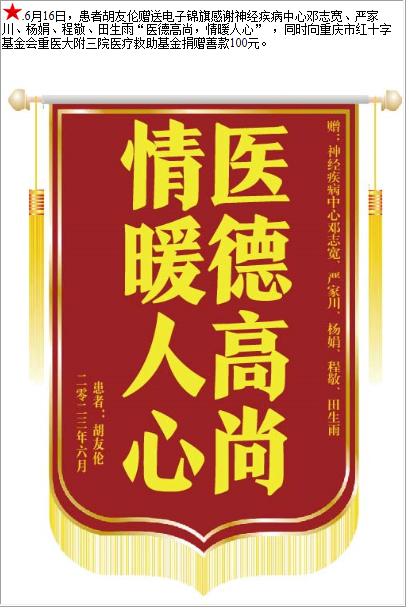 患者胡友伦赠送电子锦旗感谢神经疾病中心邓志宽等人,并向医疗救助基金捐赠善款100元-锦旗-患者心声-患者服务-重庆医科大学附属第三医院【官方网站】