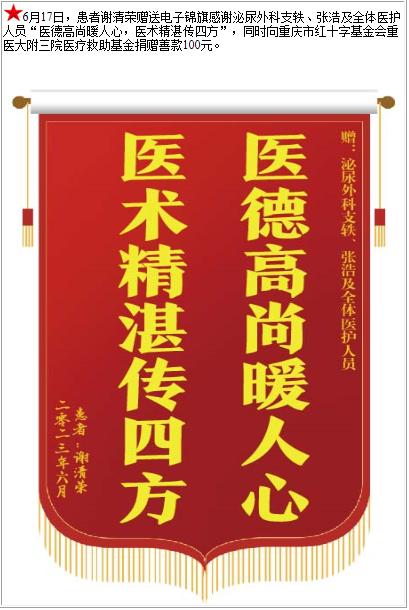 患者谢清荣赠送电子锦旗感谢泌尿外科支轶等人及全体医护人员,并向医疗救助基金捐赠善款100元-锦旗-患者心声-患者服务-重庆医科大学附属第三医院【官方网站】