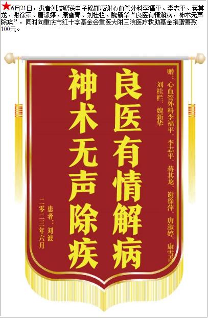 患者刘波赠送电子锦旗感谢心血管外科李福平等人,并向医疗救助基金捐赠善款100元-锦旗-患者心声-患者服务-重庆医科大学附属第三医院【官方网站】