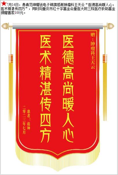 患者范珅赠送电子锦旗感谢肿瘤科王天云,并向医疗救助基金捐赠善款100元-锦旗-患者心声-患者服务-重庆医科大学附属第三医院【官方网站】