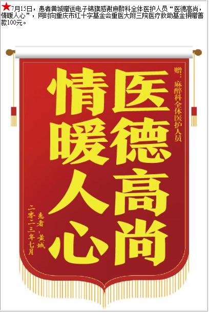 患者黄城赠送电子锦旗感谢麻醉科全体医护人员,并向医疗救助基金捐赠善款100元-锦旗-患者心声-患者服务-重庆医科大学附属第三医院【官方网站】