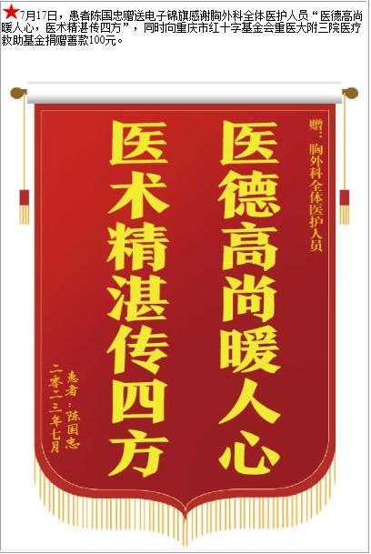 患者陈国忠赠送电子锦旗感谢胸外科全体医护人员,并向医疗救助基金捐赠善款100元-锦旗-患者心声-患者服务-重庆医科大学附属第三医院【官方网站】