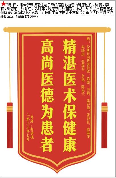 患者郭荣德赠送电子锦旗感谢心血管内科唐胜欣等人,并向医疗救助基金捐赠善款100元-锦旗-患者心声-患者服务-重庆医科大学附属第三医院【官方网站】