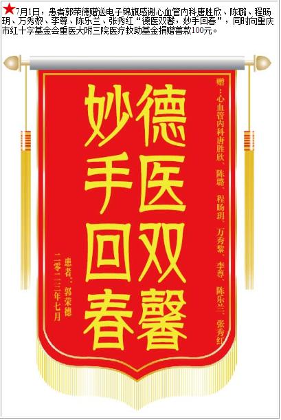 患者郭荣德赠送电子锦旗感谢心血管内科唐胜欣等人,并向医疗救助基金捐赠善款100元-锦旗-患者心声-患者服务-重庆医科大学附属第三医院【官方网站】