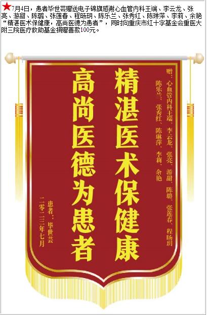 患者毕世芸赠送电子锦旗感谢心血管内科王端等人,并向医疗救助基金捐赠善款100元-锦旗-患者心声-患者服务-重庆医科大学附属第三医院【官方网站】