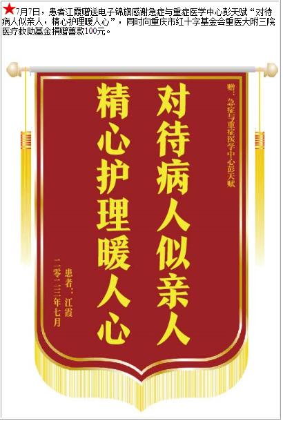 患者江霞赠送电子锦旗感谢急症与重症医学中心彭天赋,并向医疗救助基金捐赠善款100元-锦旗-患者心声-患者服务-重庆医科大学附属第三医院【官方网站】