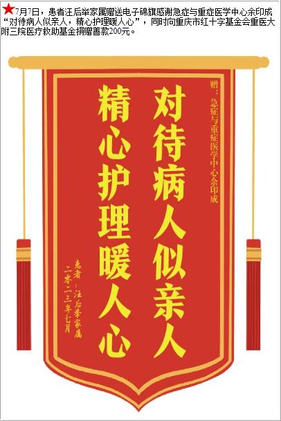 患者汪后举家属赠送电子锦旗感谢急症与重症医学中心余印成,并向医疗救助基金捐赠善款200元-锦旗-患者心声-患者服务-重庆医科大学附属第三医院【官方网站】
