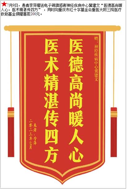 患者李萍赠送电子锦旗感谢神经疾病中心冀建文,并向医疗救助基金捐赠善款200元-锦旗-患者心声-患者服务-重庆医科大学附属第三医院【官方网站】