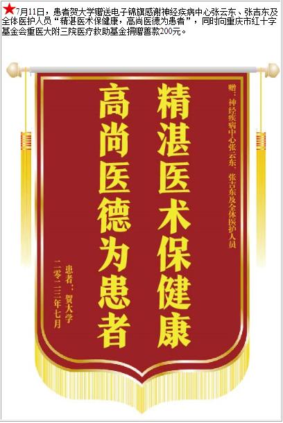 患者贺大学赠送电子锦旗感谢神经疾病中心张云东等人及全体医护人员,并向医疗救助基金捐赠善款200元-锦旗-患者心声-患者服务-重庆医科大学附属第三医院【官方网站】