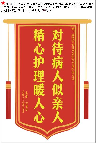 患者邓贵万赠送电子锦旗感谢感染疾病科罗荣红及全体护理人员 ,并向医疗救助基金捐赠善款100元-锦旗-患者心声-患者服务-重庆医科大学附属第三医院【官方网站】