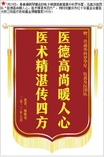 患者操晓琴赠送的电子锦旗感谢普通外科罗华星等人及医疗团队,并向医疗救助基金捐赠善款100元-锦旗-患者心声-患者服务-重庆医科大学附属第三医院【官方网站】