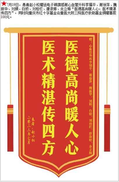 患者赵小松赠送电子锦旗感谢心血管外科李福平等人,并向医疗救助基金捐赠善款100元-锦旗-患者心声-患者服务-重庆医科大学附属第三医院【官方网站】