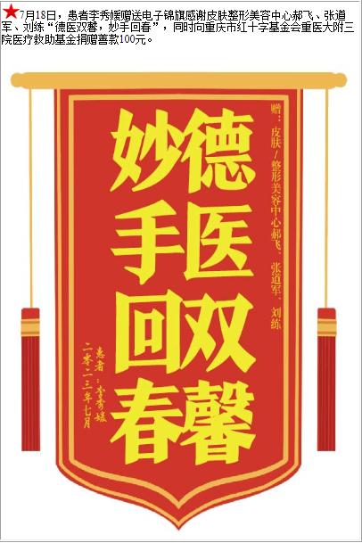 患者李秀媛赠送电子锦旗感谢皮肤整形美容中心郝飞等人,并向医疗救助基金捐赠善款100元-锦旗-患者心声-患者服务-重庆医科大学附属第三医院【官方网站】